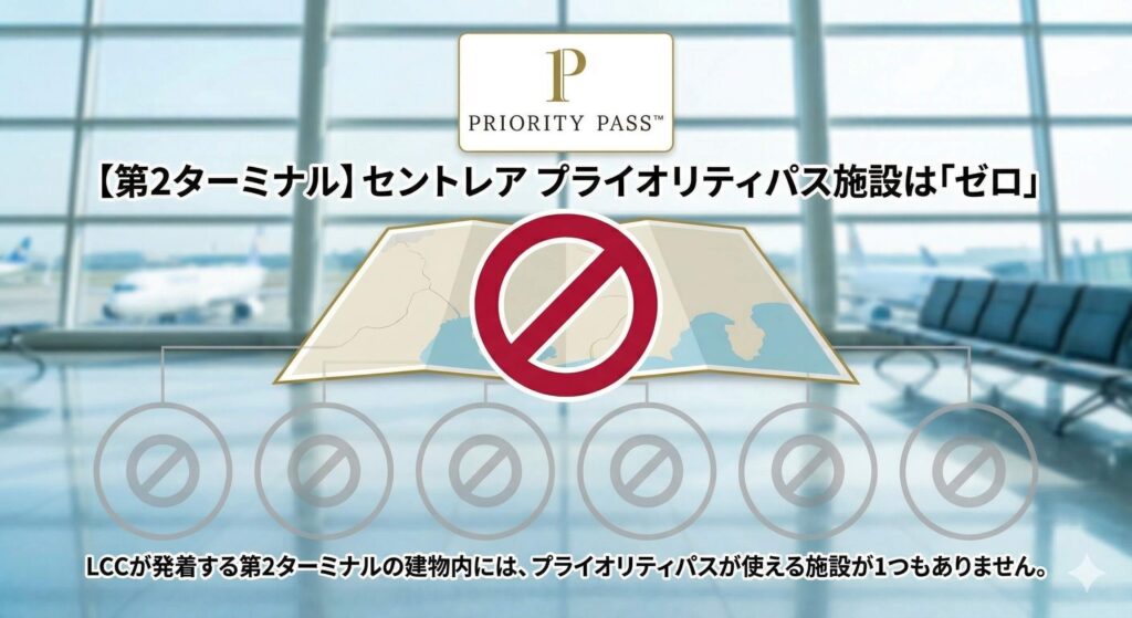 そして、セントレアでプライオリティパスを利用する上で絶対に知っておきたいのが、対象施設のほとんどが第1ターミナルに集中しており、第2ターミナル内には1つも無いということです。