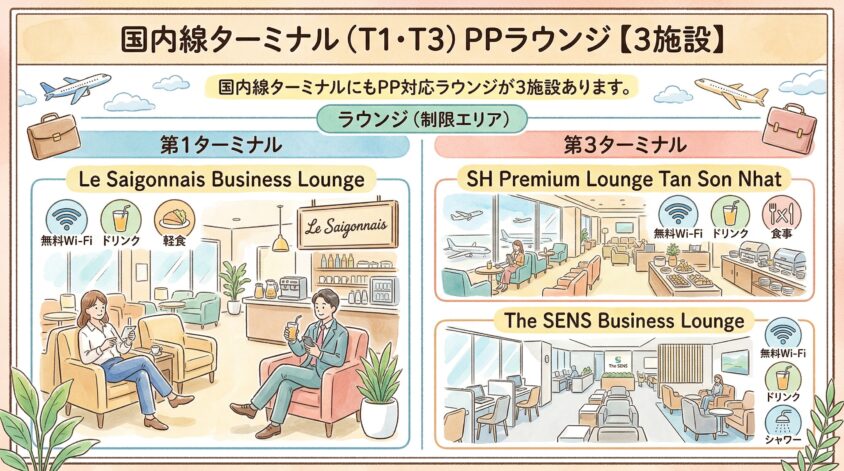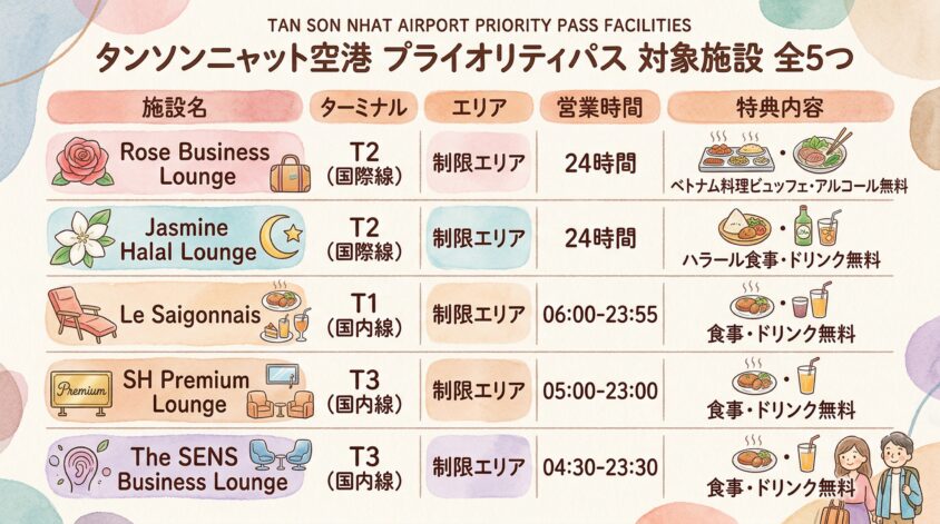 ターミナル構造を把握したところで、2026年最新のタンソンニャット空港プライオリティパス対象施設は全部で5つです。