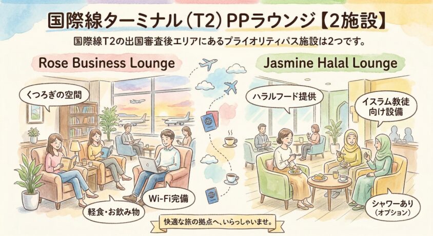全5施設(国際線2+国内線3)です。日本人旅行者のメインはT2のRose Business LoungeとJasmine Halal Loungeの2施設です。