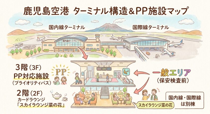 まずは、プライオリティパスを使い倒すための前提知識として、鹿児島空港のターミナル構造をざっくり理解しておきましょう。