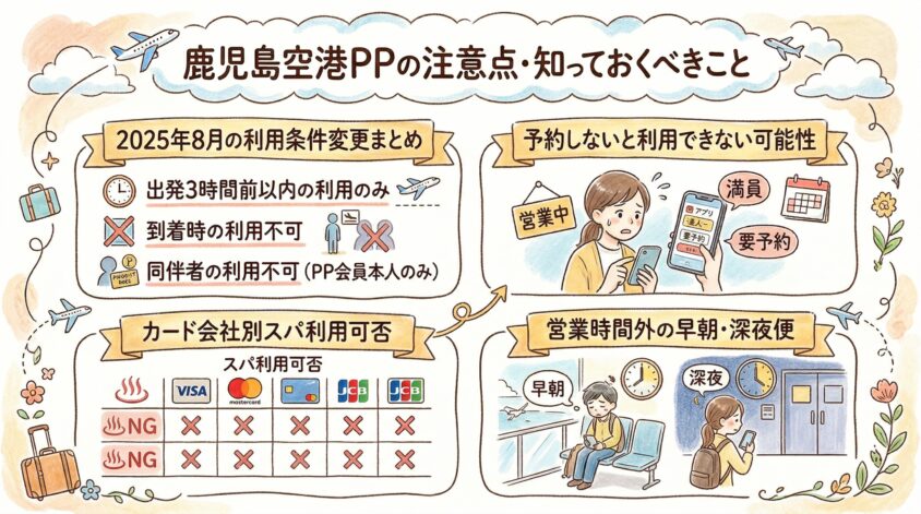 鹿児島空港のPP対応施設はスパのみのため、スパ利用不可のカードでは鹿児島空港でPPの恩恵を一切受けられないことになります。