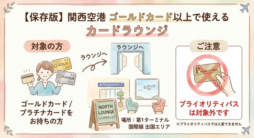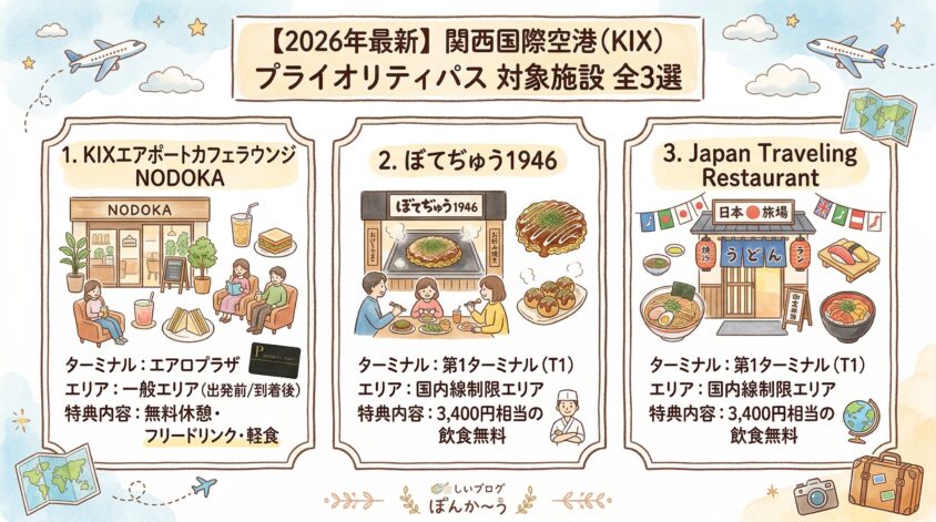 全体の構造を把握したところで、現在(2026年最新)関西空港のプライオリティパス対象施設は全部で4つです。