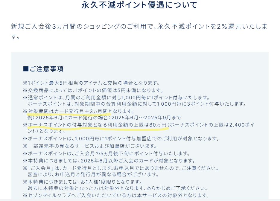 ただし、ボーナスポイントの付与対象となる利用金額の上限は80万円(ボーナスポイントの上限は2,400ポイント)までです。