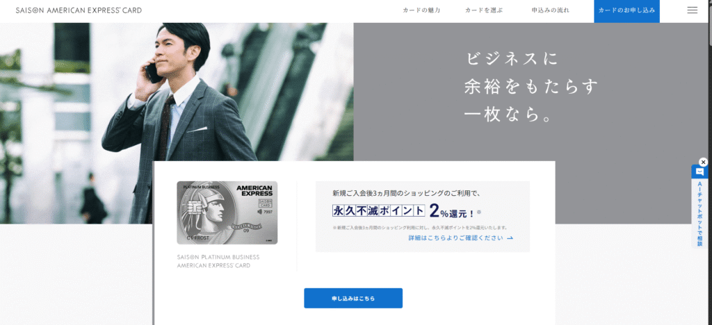 公式サイト(セゾンプラチナ・ビジネス・アメリカン・エキスプレス®・カード) | 初年度年会費33,000円分無料 | 永久不滅ポイント2%還元 | |